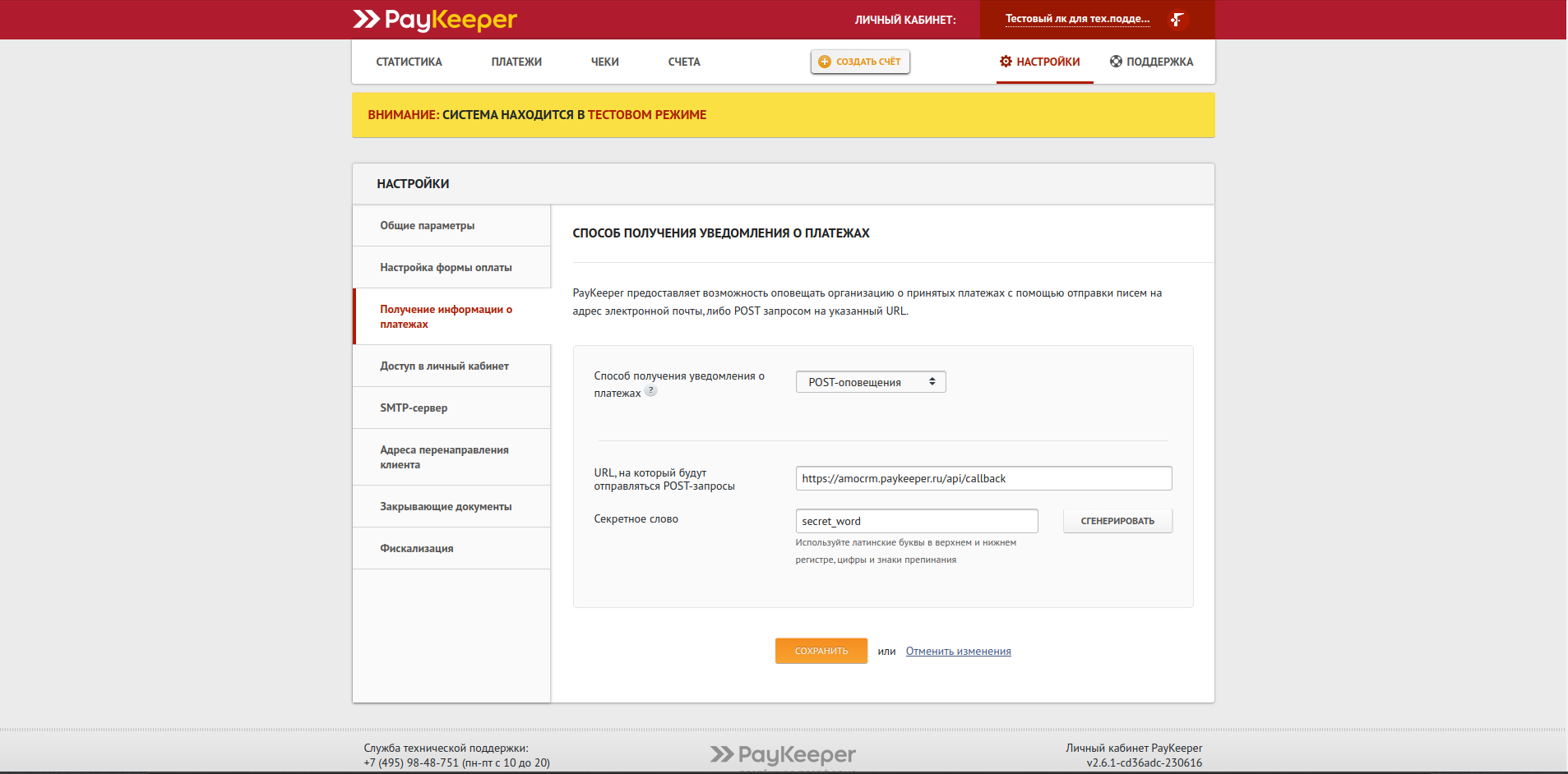 - В поле «URL, на который будут отправляться POST-запросы» введите https://amocrm.paykeeper.ru/api/callback