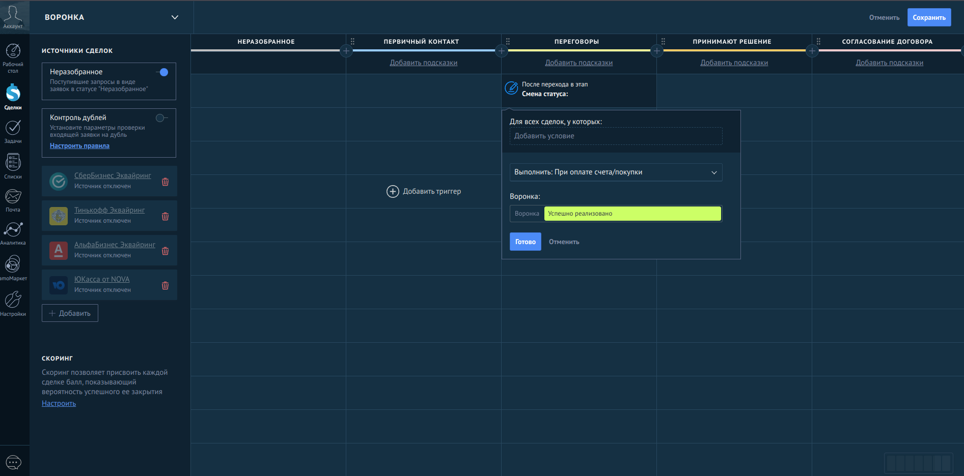 В окошке настройки триггера выберите в выпадающем списке «Выполнить» выберите «При оплате счета/покупки». В выпадающем списке «Воронка » выберите статус на который сделка перейдет, например «Успешно реализовано». Нажмите «Готово». Пять кликов и все настроено!