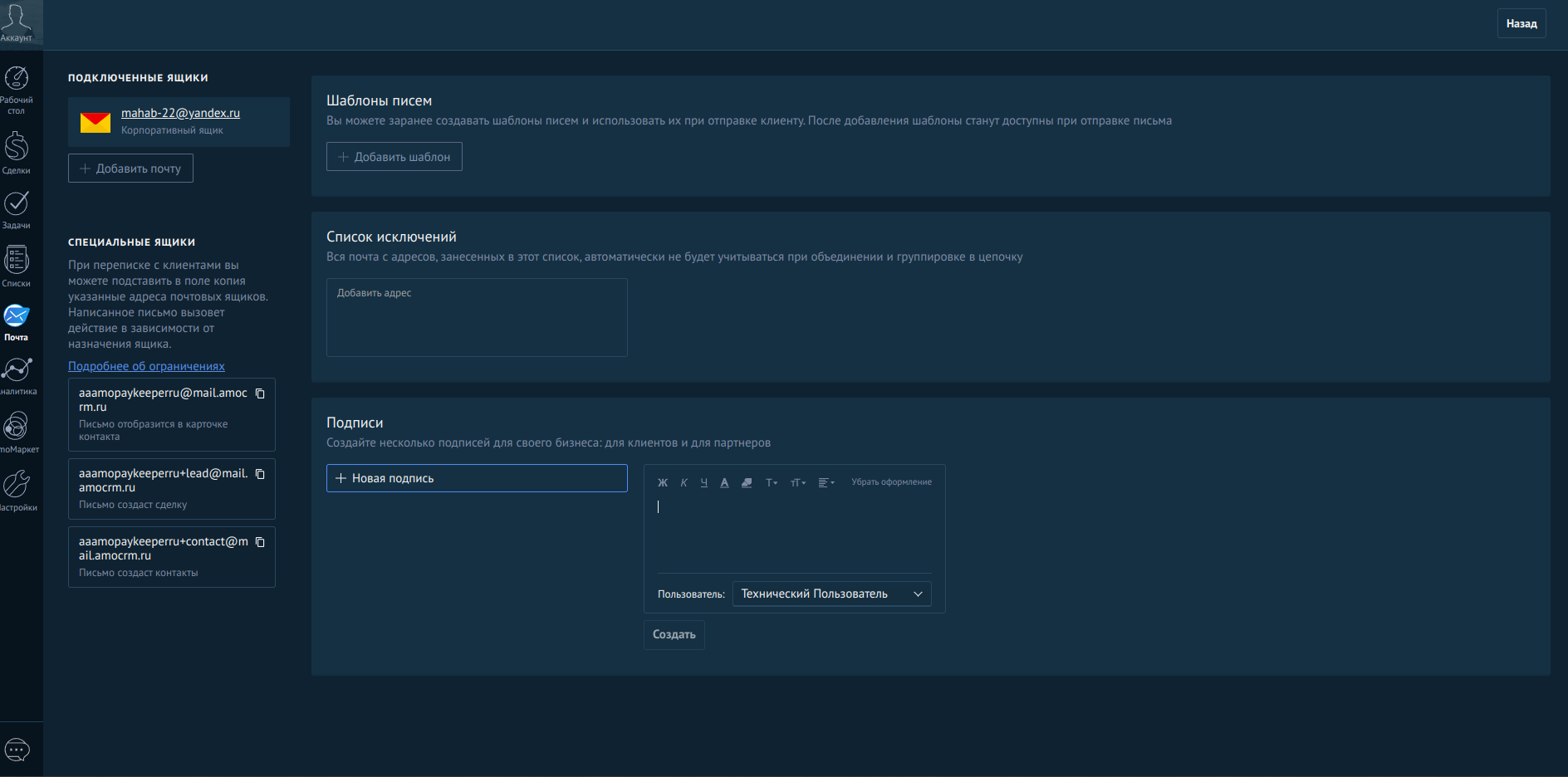 - Нажмите кнопку «Добавить». Данные нового пользователя понадобятся для настройки интеграции в amoCRM.