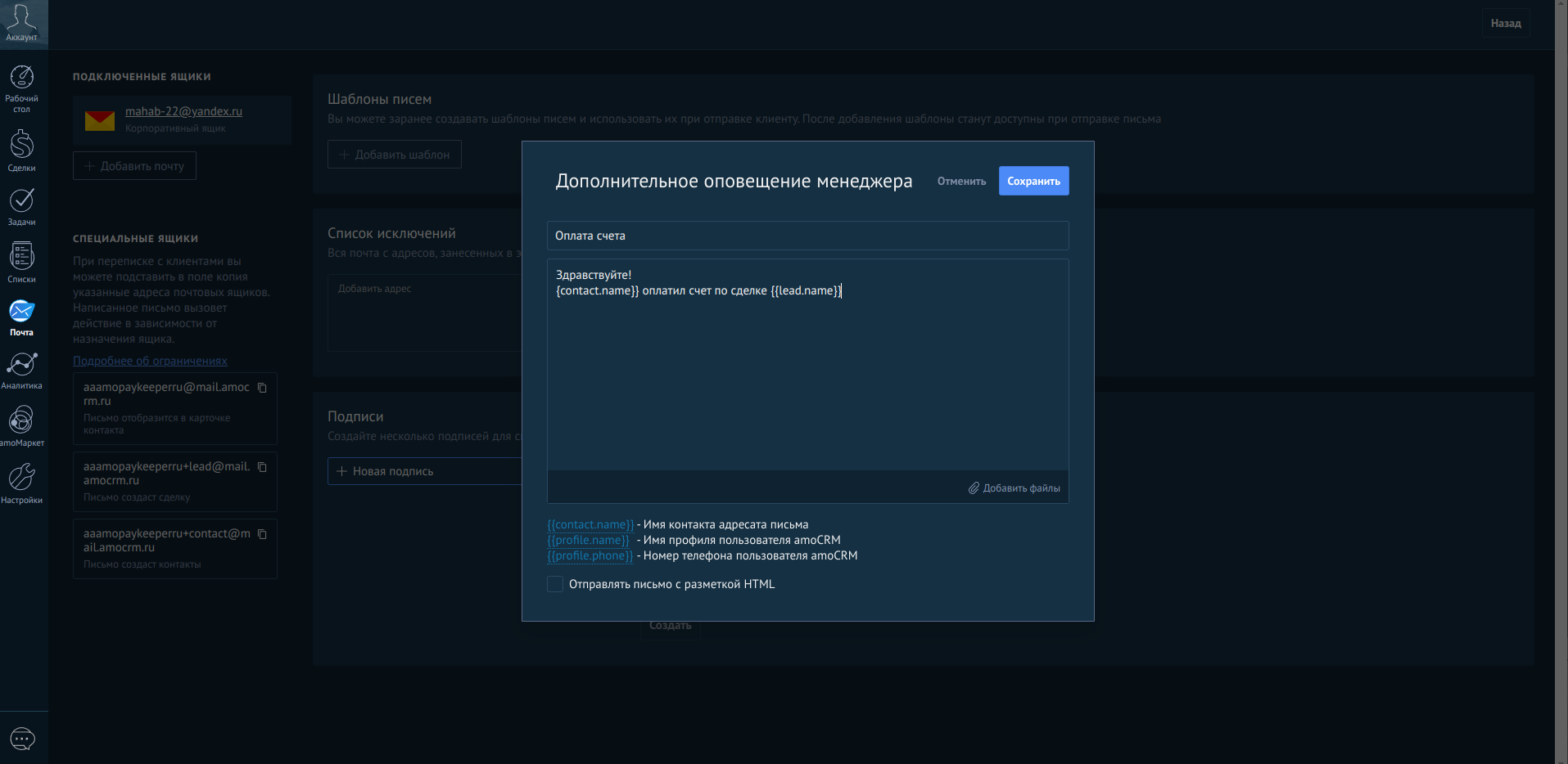 Бонус 2. Настройка отправки дополнительного письма при оплате счета по сделке.