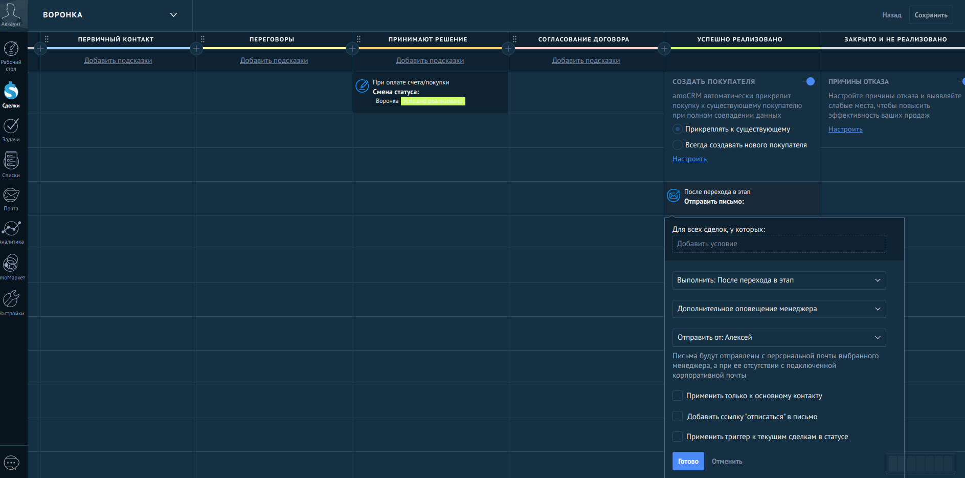Перейдите в раздел «Сделки» — «Настройка воронки», добавьте триггер на тот статус, на который переходит сделка , например «Успешно реализован», выберите в меню пункт «Отправить письмо». В настройках триггера укажите в выпадающих списках: