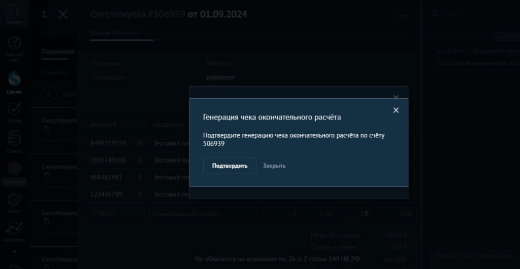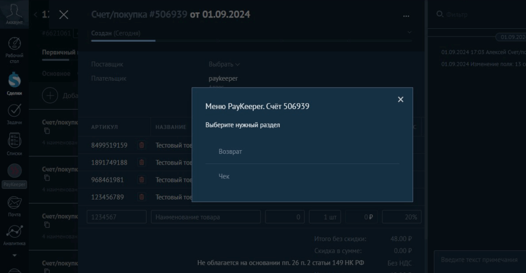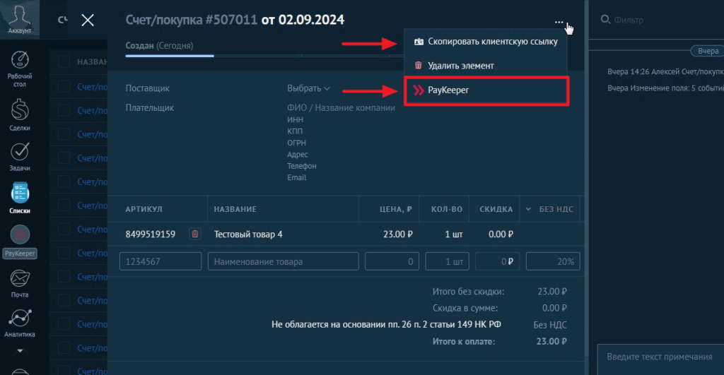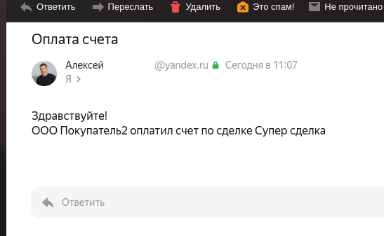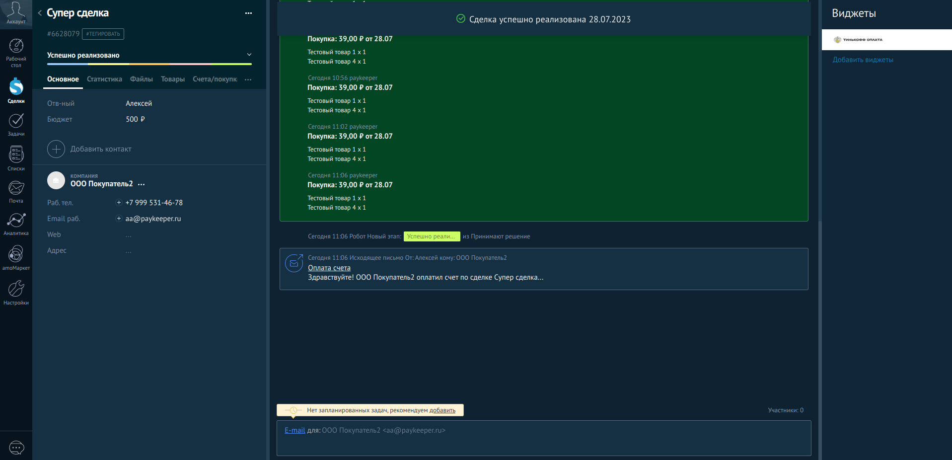 В итоге, после оплаты счета, в карточке сделки добавится сообщение об отправке письма.