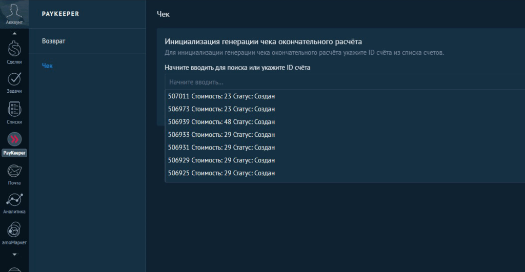 Внимание! В amoCRM есть ограничение: кнопка «Оплатить счет» будет отправлять на последний установленный эквайринг. Это означает, что при изменении эквайринга в настройках интеграции все предыдущие созданные счета будут перенаправлять уже на вновь установленный.