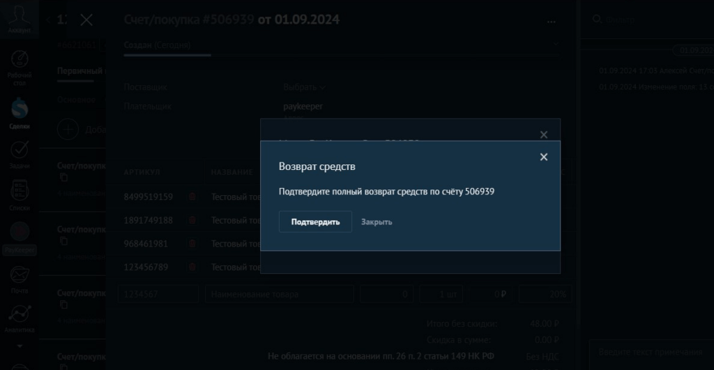 Полный возврат по счёту и генерация чека окончательного расчёта на странице приложения PayKeeper