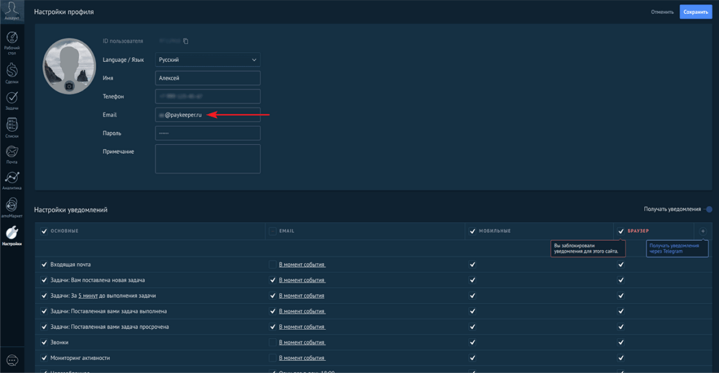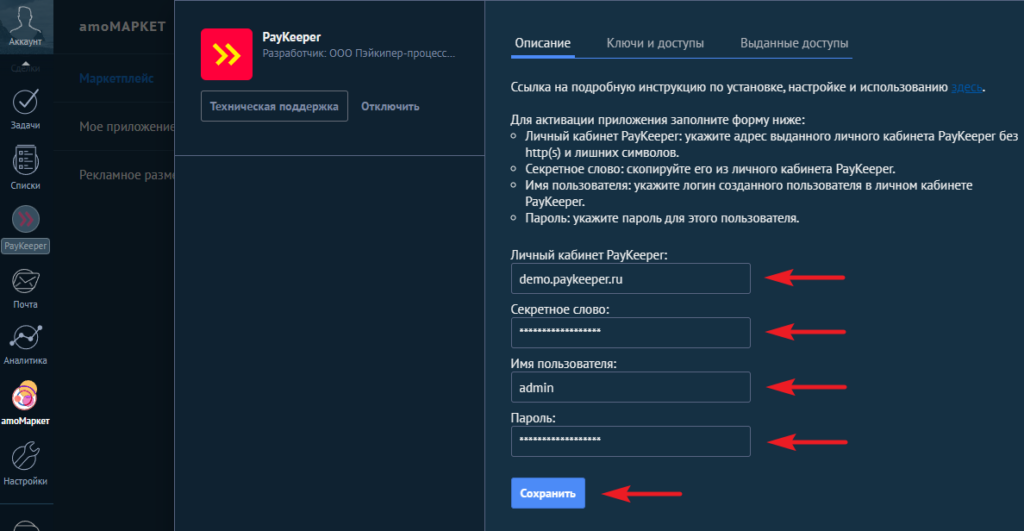 - В поле «Секретное слово» укажите секретное слово из личного кабинета PayKeeper. Секретные слова в amoCRM и личном кабинете Paykeeper должны совпадать.