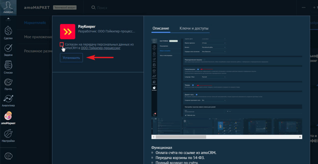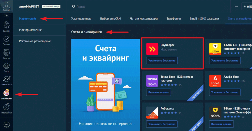 - Найдите приложение PayKeeper в разделе «Счета и эквайринги» маркетплейса amoCRM. Для этого можно воспользоваться строкой поиска, находящейся в самом верху страницы.