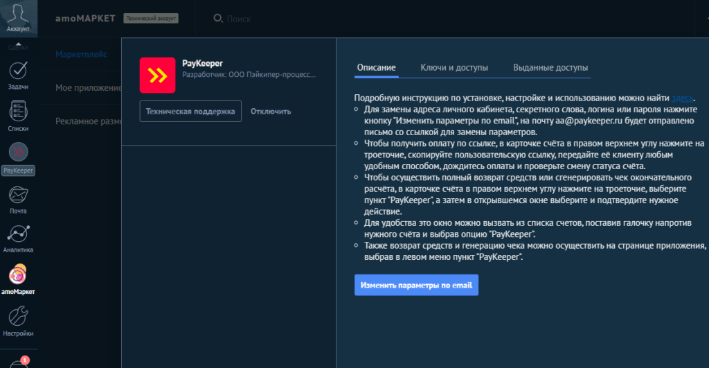 - Кликните по приложению PayKeeper и в модальном окне нажмите на кнопку «Изменить параметры по email».