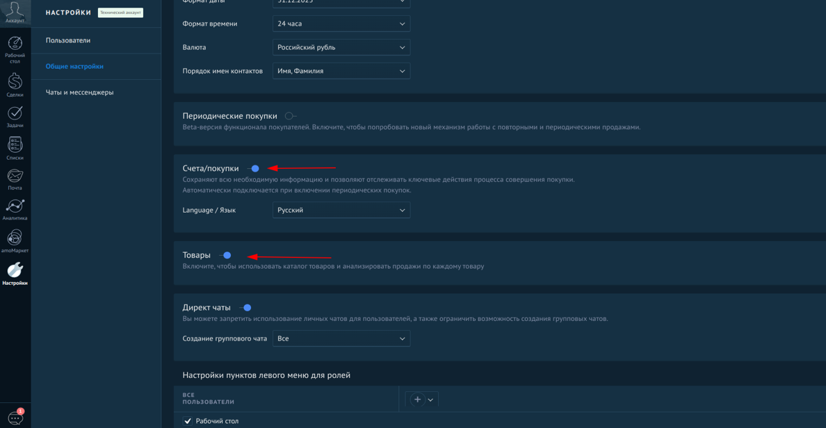 - Включите флажки напротив пунктов «Счета/покупки» и «Товары» для активации этих категорий.