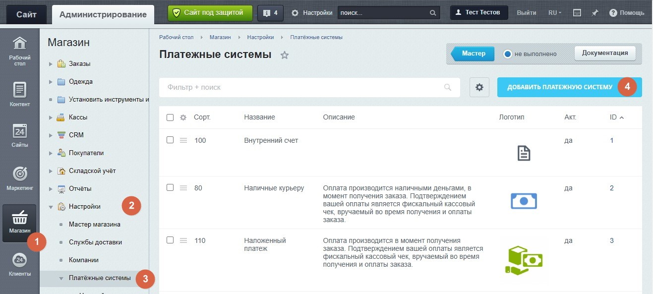 2.1. В панели администрирования CMS 1С-Битрикс перейдите в раздел «Магазин» -> «Настройки» -> «Платёжные системы» и нажмите на кнопку «Добавить платёжную систему» (рисунок 2.1).