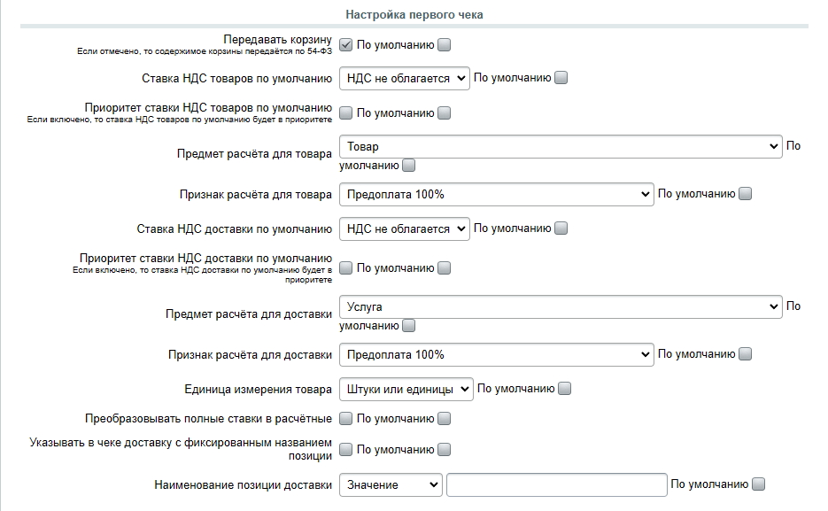 Приоритет ставки НДС доставки по умолчаниюЕсли опция включена, то даже если в 1С-Битрикс настроена ставка НДС для доставки, в чеке будет передана указанная ставка НДС доставки по умолчанию, то есть будет в приоритете. Если опцию отключить, то приоритетность будет обратной.