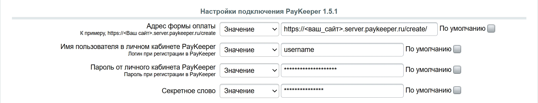 Пароль от личного кабинета PayKeeperВ этом поле необходимо указать пароль, используемый для входа в личный кабинет PayKeeper (данный параметр необходимо заполнить для работоспособности возвратов из административного раздела 1С-Битрикс).