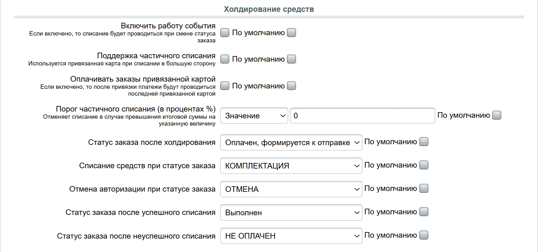 2.8. Раздел «Холдирование средств» (рисунок 2.8). Перед настройкой раздела при необходимости можно создать дополнительные статусы заказа. Управление статусами осуществляется на странице «Статусы заказа» («Магазин» -> «Настройки» -> «Статусы»).