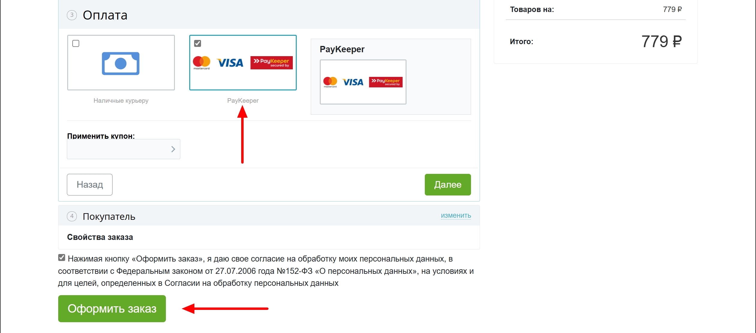 5.1. Покупатель оформляет заказ на сайте, выбрав способ оплаты с обработчиком PayKeeper.