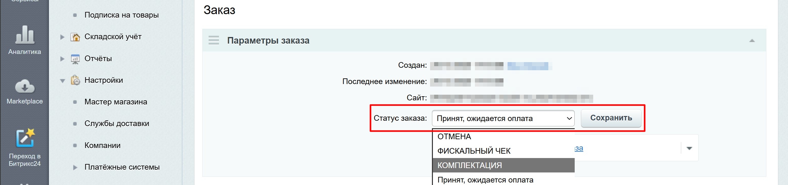 4.2. В открывшемся окне в поле Статус поменяйте «Оплачено» на «Возврат» и в выпадающем меню «Вернуть на» укажите PayKeeper (рисунок 4.2). Нажмите кнопку сохранить внизу экрана.