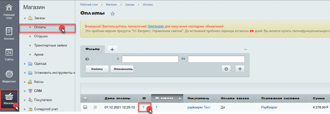 Для осуществления возврата через платежную систему PayKeeper Вам необходимо настроить модуль по инструкции далее перейти в административную панель – «Магазин» — «Заказы» — «Оплаты». Выбрать необходимый заказ, оплаченный ранее через платежную систему PayKeeper и нажать на соответствующий номер из колонки ID.