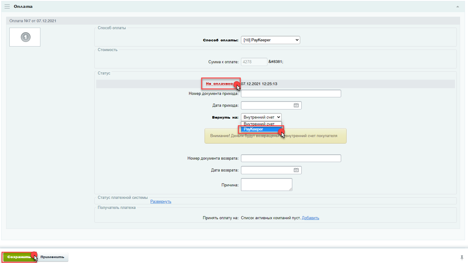 В открывшемся окне в Поле Статус поменяйте «Оплачено» на «Возврат» и в выпадающем меню «Вернуть на» укажите PayKeeper. Нажмите кнопку сохранить внизу экрана.