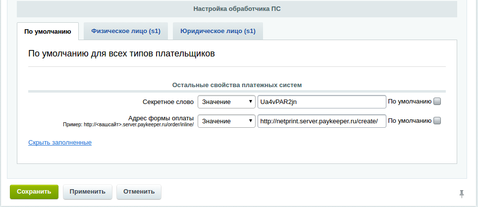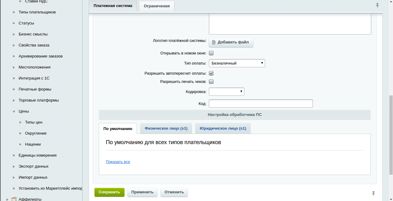 В разделе «Настройка обработчика ПС» выбираем вкладку «По умолчанию» («По умолчанию для всех типов плательщиков»).
