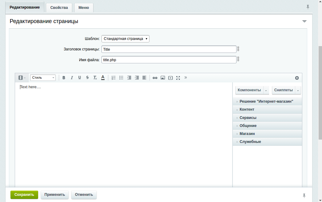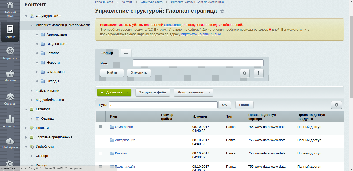 Вам нужно создать пустую страницу и разместить на ней компонент «Обработчик платежной системы». Для этого перейдите в раздел «Контент», раскройте список «Структура сайта» и нажмите на Ваш интернет-магазин. В правой области страницы (рисунок 5) выберите «Добавить» и выберите «добавить файл».