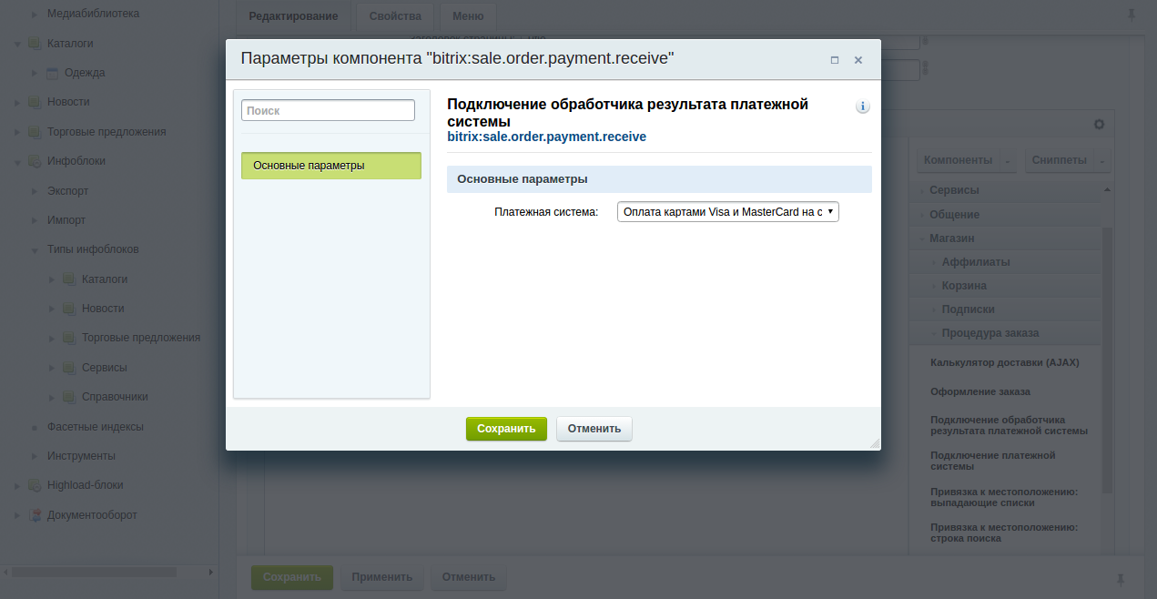 В списке компонентов в правой части редактора выберите «Магазин»-> «Процедура заказа» и перетащите компонент «Подключение обработчика результата платежной системы» в область редактирования. После этого сделайте на нем двойной клик, чтобы открылось окно параметров компонента (рисунок 7).