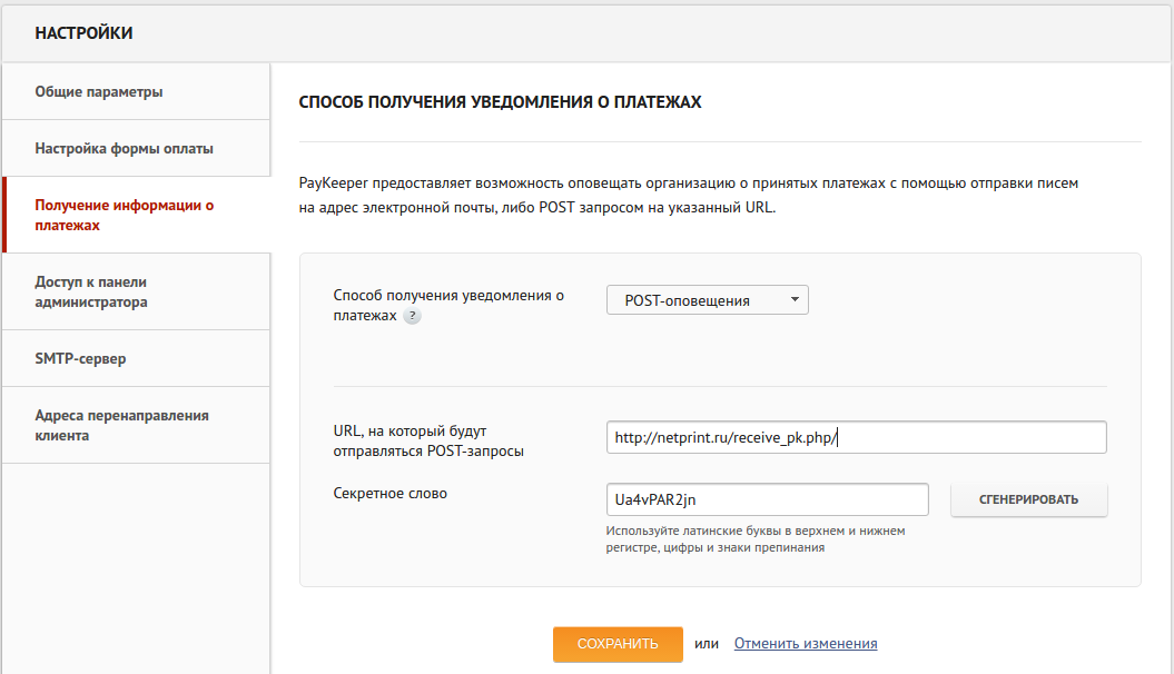 Секретное слово необходимо сгенерировать в личном кабинете PayKeeper, скопировать и вставить в поле «Cекретное слово». (См. рисунок 4.)