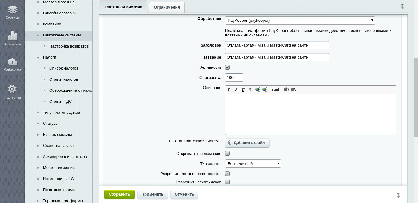 В выпадающем списке «Платѐжная система» выберите «Оплата Visa/MasterCard» (то значение которое вы указали в пункте 3). После редактирования параметров нажмите кнопку «Сохранить», введите имя файла (например, receive_pk.php), любой заголовок и сохраните результат.
