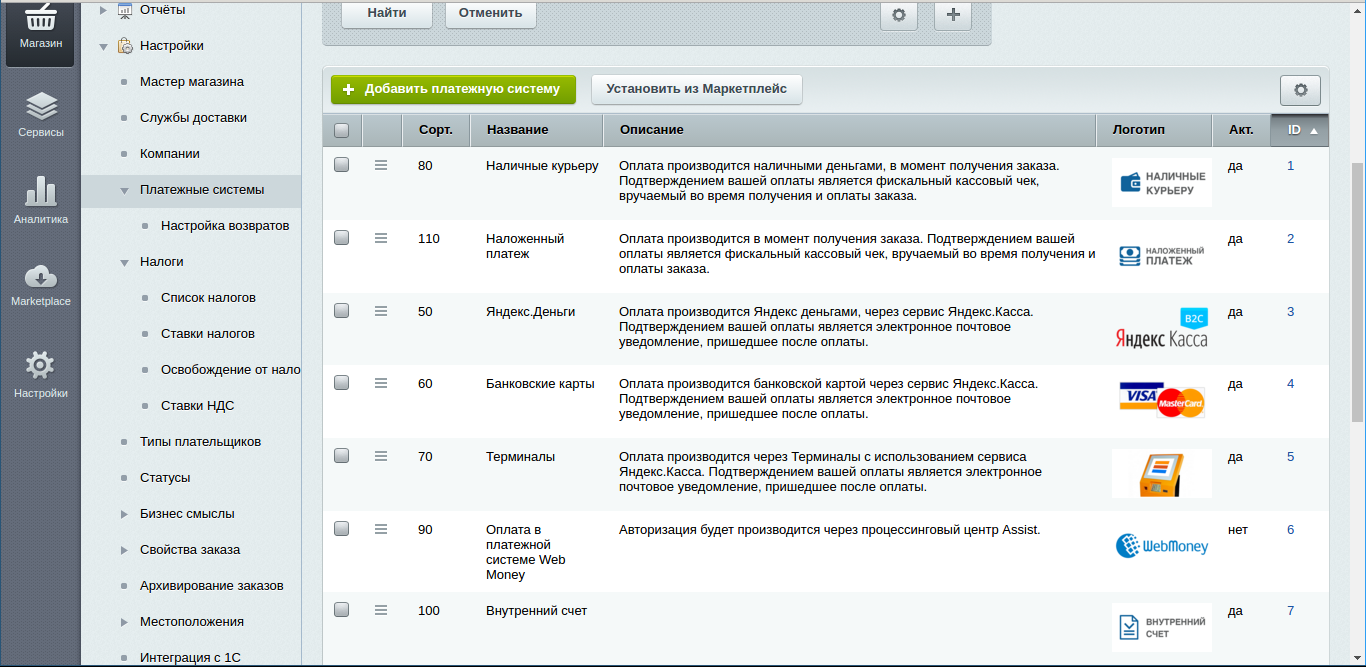 В панели администрирования Bitrix, зайдите в раздел «Магазин» -> «Настройки» -> «Платежные системы» и нажмите на кнопку «Добавить платежную систему» (рисунок 1).