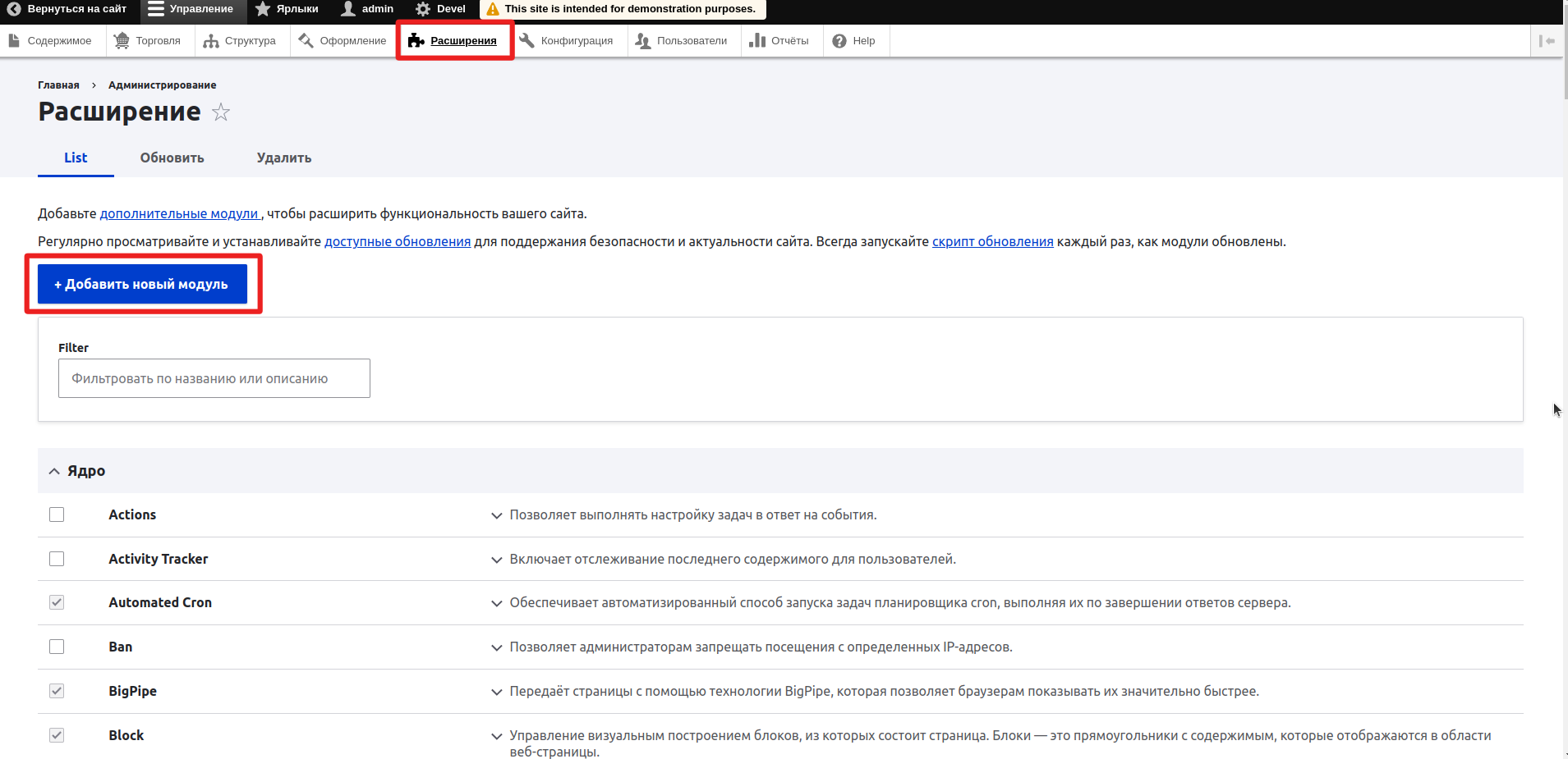 — Перейдите в раздел раздел «Расширения» в верхней части экрана и нажмите кнопку «Добавить новый модуль».
