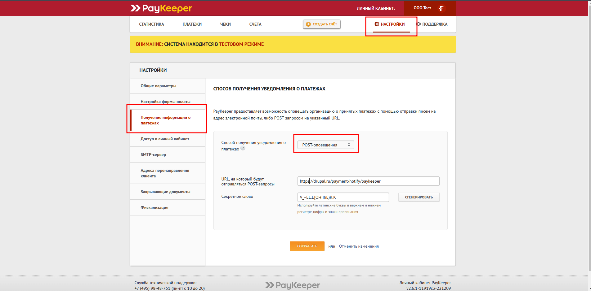 Зайдите в раздел настройка личного кабинета на вкладку «Получение информации о платежах», выберите способ получения уведомления о платежах «POST-оповещения», введите или сгенерируйте секретное слово, оно должно быть одинаковым с «Secret word» в панели администратора сайта. В поле «URL, на который будут отправляться POST-запросы» введите конкатенацию адреса своего сайта и адреса процедуры обратного оповещения https://example.ru/payment/notify/{машинное имя шлюза оплаты}. Например https://example.ru/payment/notify/paykeeper. Машинное имя шлюза мы вводили при создании нового платежного шлюза.