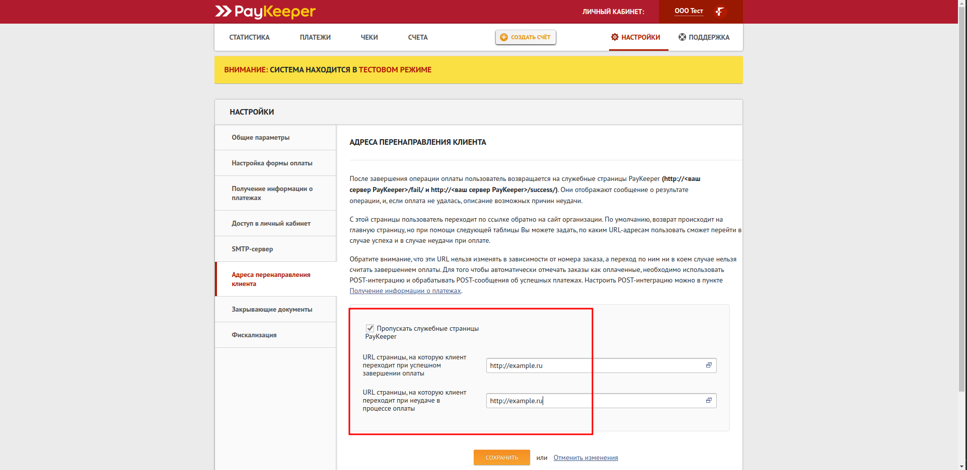 Перейдите на вкладку «Адреса Перенаправления Клиента» и введите адреса перенаправления при успешной и неуспешной оплате.