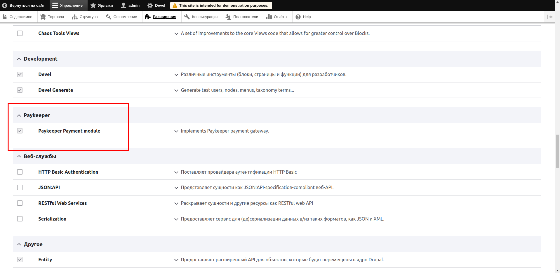 После установки, нужно перейти в раздел «Расширения», установить галочку в строке «Paykeeper Payment module» и нажать кнопку установить внизу всего списка модулей. Таким образом, вы активируете модуль оплаты.
