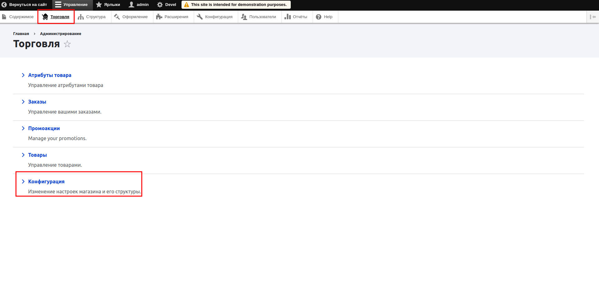 — Перейдите в раздел торговля и нажмите в меню «Конфигурация»