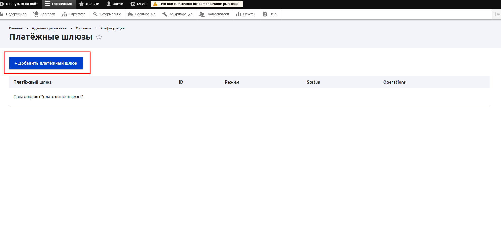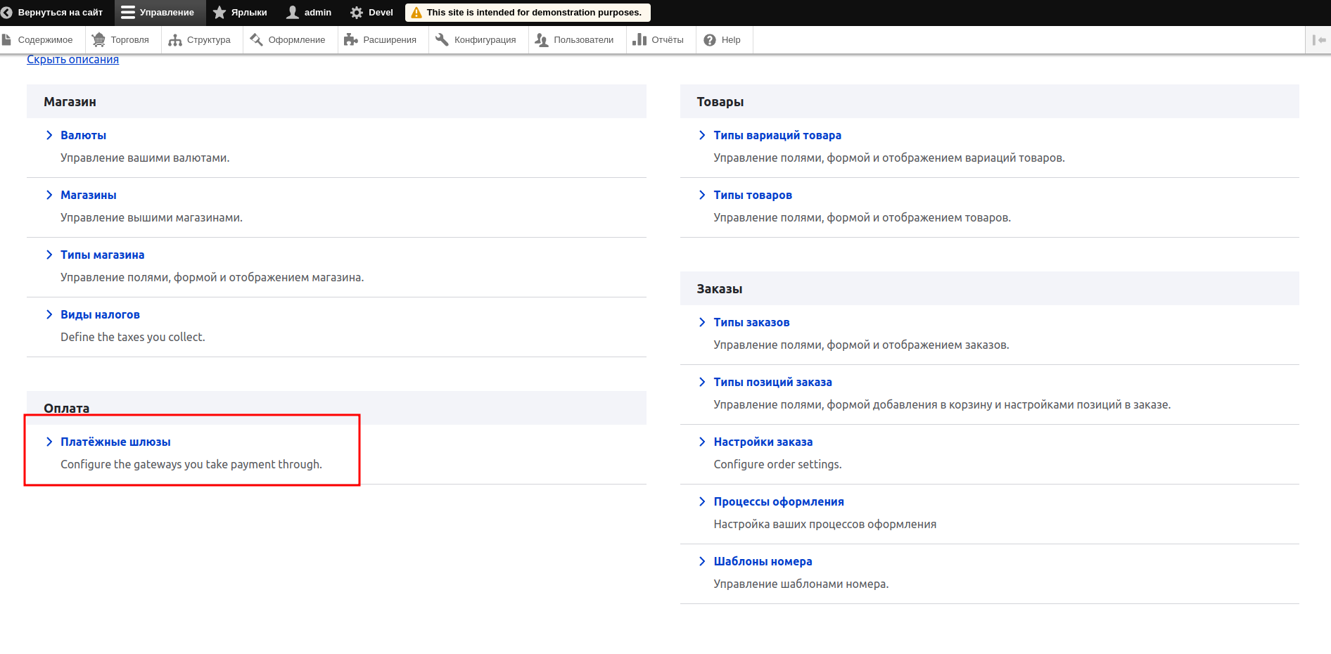 1. CMS Drupal — очень гибкая и сложная система управления контентом, которая подразумевает множество вариантов настройки. Учесть все варианты конфигурации модулей и настроек невозможно. Модуль оплаты выполнен с учетом минимальной конфигурации модулей. В эту кофигурацию входит CMS Drupal, установленная с помощью пакетного менеджера composer в соответствии с официальной документацией, модуль commerce, установленный в соответствии с официальной документацией с сайта www.drupal.org, а также всех зависимостей для данных модулей.