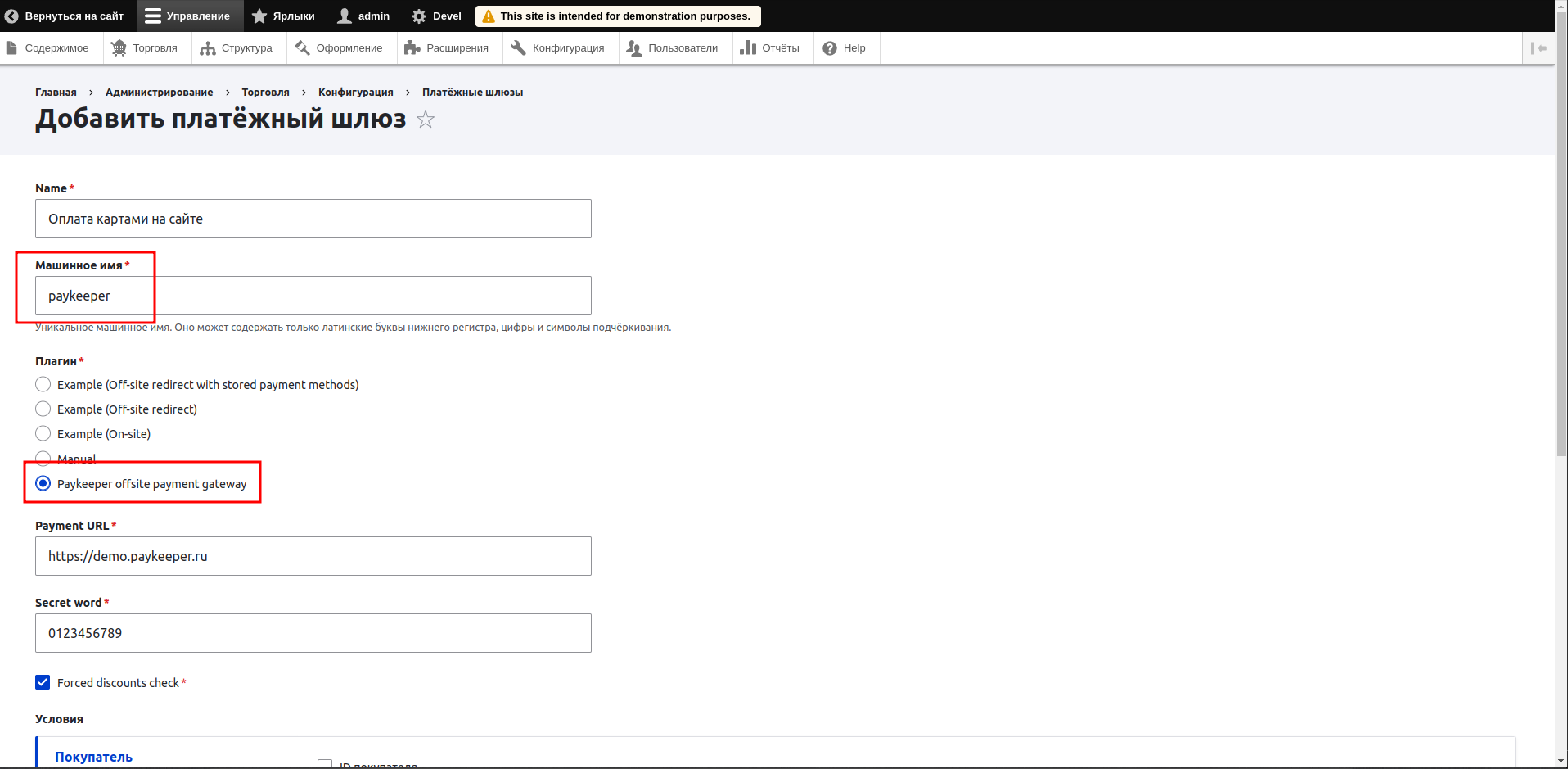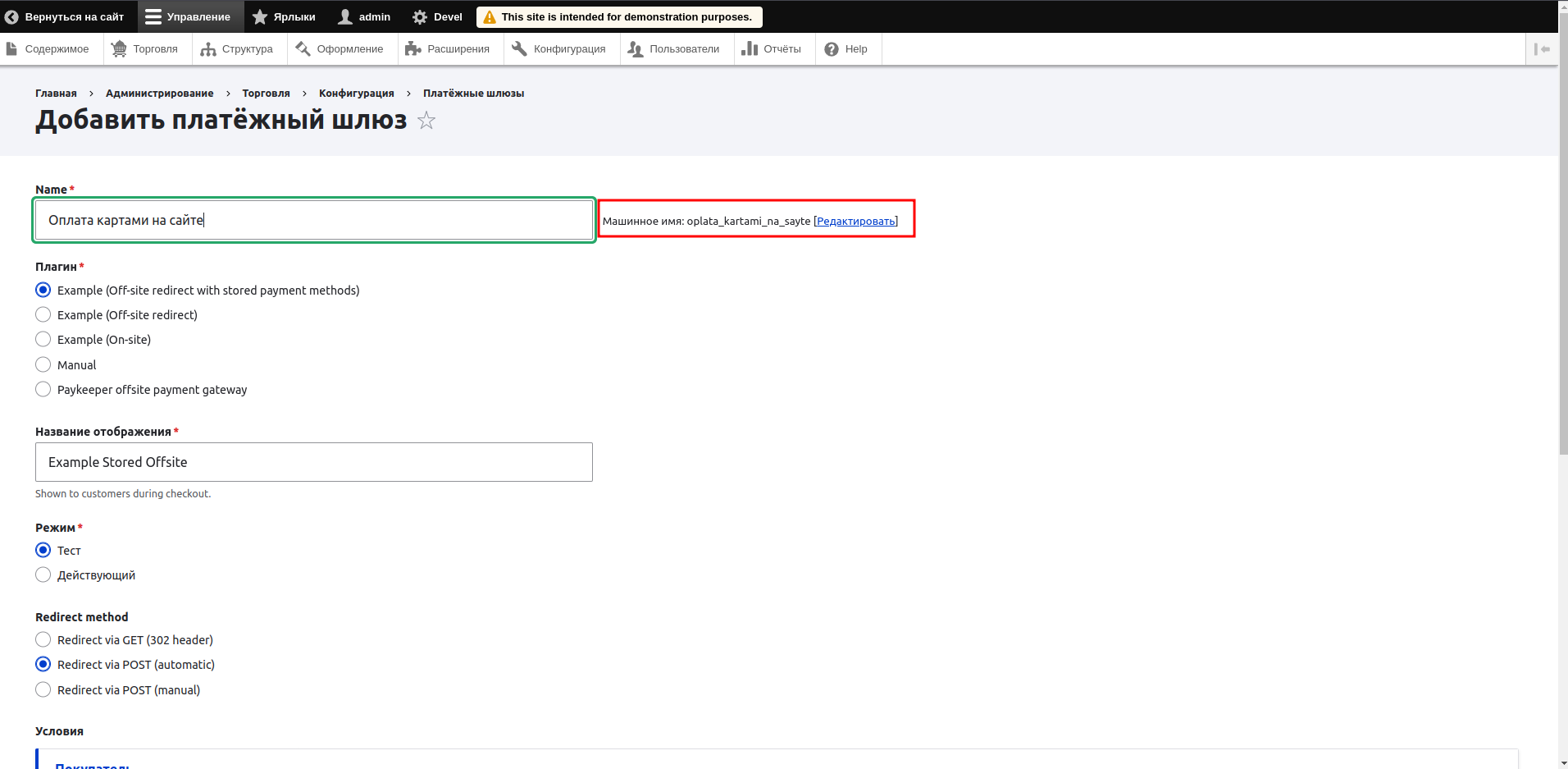 Заполните поле «name», появится возможность редактировать машинное имя платежного шлюза. Нажмите «Редактировать» и введите короткое слово латиницей строчными буквами например «paykeeper» — это слово важно запомнить, оно понадобится для настройки обратного оповещения.