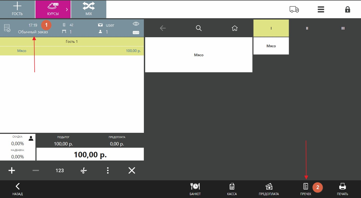 При типе обслуживания РЕСТОРАН. Переходим в заказ. Выбираем тип заказа (рисунок 1. п.1). Нажимаем ПРЕЧЕК (рисунок 1. п.2). Пречек печатается с QR-кодом. В этот момент создается платеж в кабинете PayKeeper. Инициируется периодическая проверка статуса платежа до момента оплаты по QR-коду. После успешной оплаты в заказ будет добавлена оплата PayKeeper. Заказ будет закрыт.