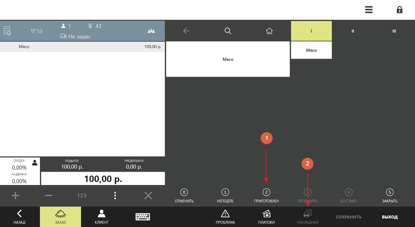 При типе обслуживания ДОСТАВКА. Переходим в заказ. Нажимаем ПРИГОТОВЛЕН. После этого печатается накладная с QR-кодом. В этот момент создается платеж в кабинете PayKeeper. Инициируется периодическая проверка статуса платежа до момента оплаты по QR-коду. После успешной оплаты в заказ будет добавлена оплата PayKeeper. Заказ будет закрыт.