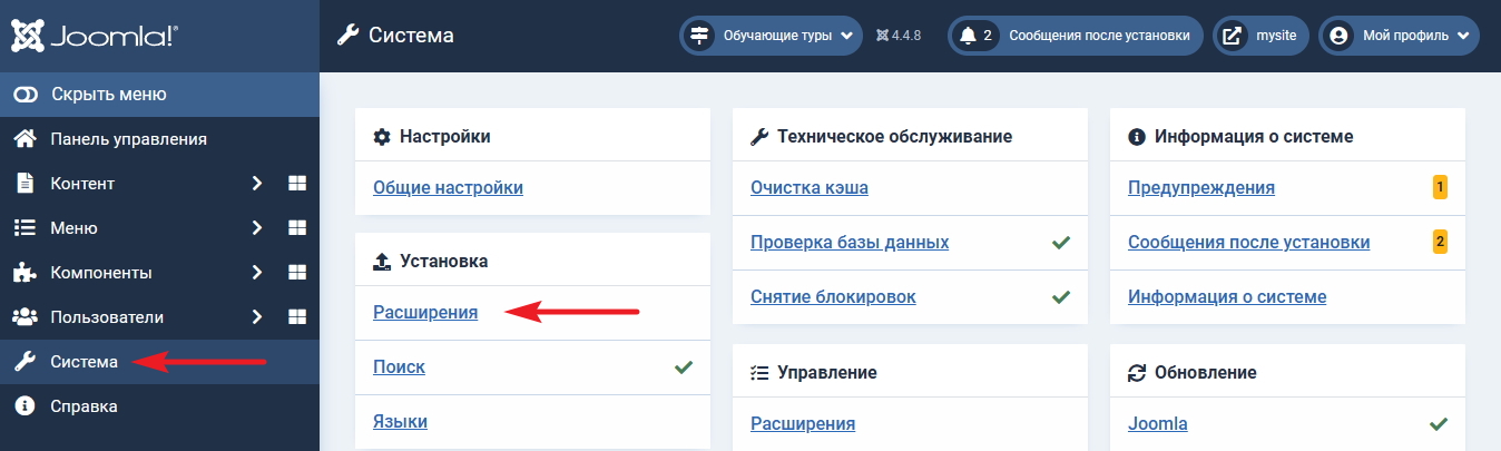Скачайте установочный архив с плагином PayKeeper на нашем сайте. Перейдите в административную панель CMS Joomla и в главном меню выберите раздел «Система». Далее на открывшейся странице в блоке «Установка» выберите «Расширения» (рисунок 1.1).