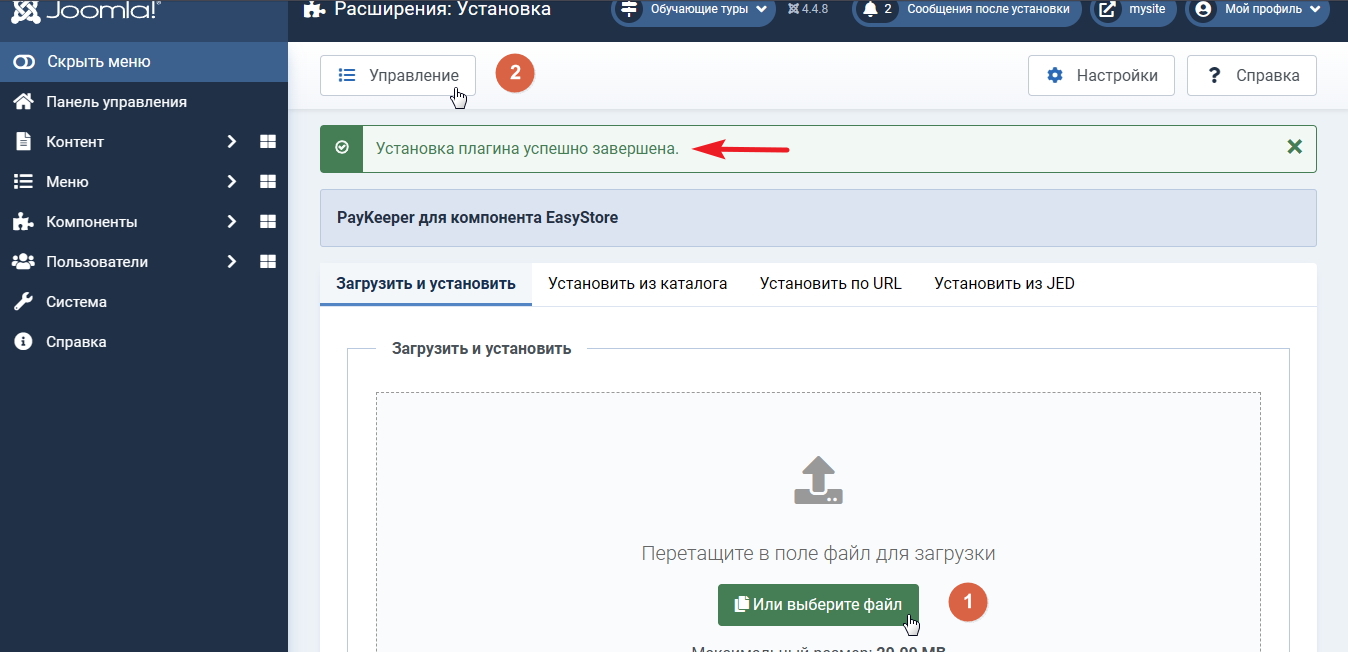 Перетащите файл архива с плагином PayKeeper в указанную область или нажмите кнопку выбора файла для начала загрузки. После загрузки дождитесь уведомления об успешной установке плагина. Далее на этой же странице нажмите кнопку «Управление» (рисунок 1.2).
