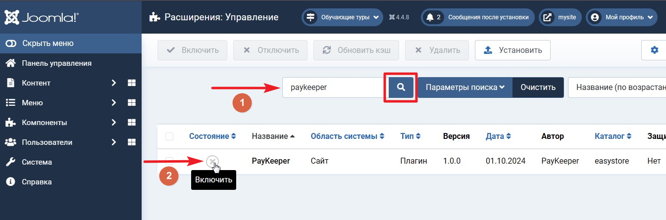 На открывшейся странице введите в поле поиска слово paykeeper и нажмите значок поиска напротив поля. В списке плагинов появится установленный плагин PayKeeper. Напротив плагина PayKeeper в колонке «Состояние» кликните значок включения. После нажатия дождитесь уведомления об успешном включении плагина (рисунок 1.3).