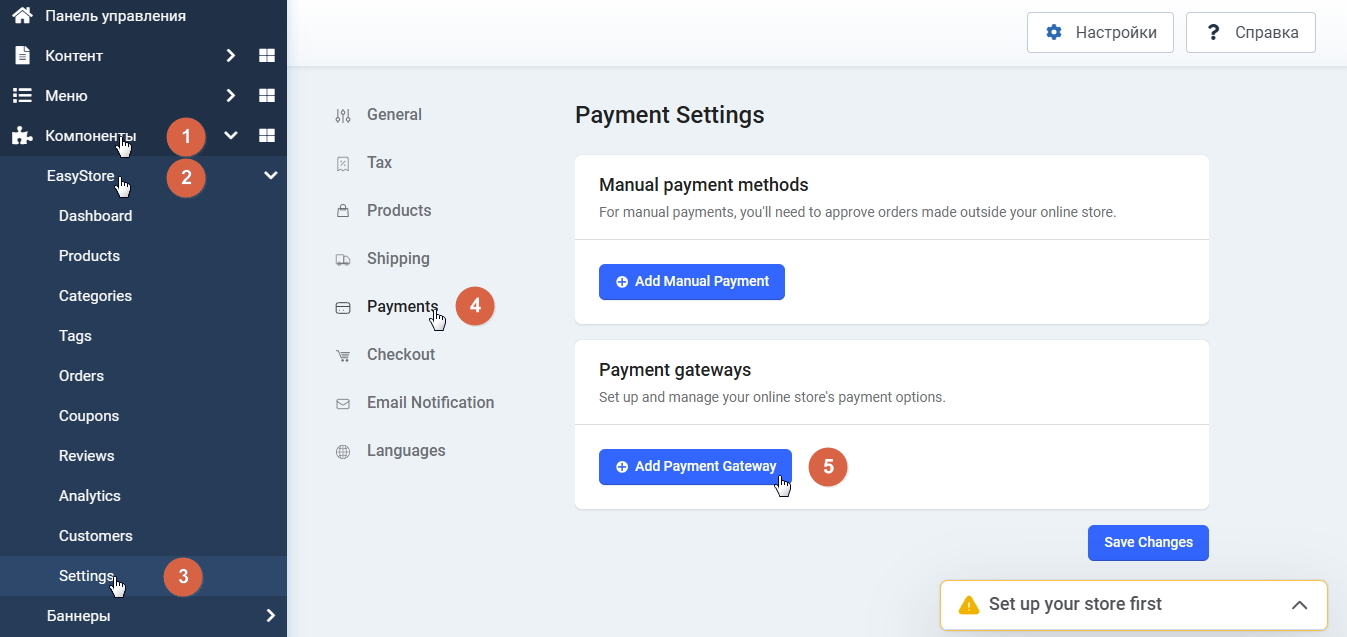 В главном меню административной панели CMS Joomla кликните пункт «Компоненты». В развернувшемся меню раскройте пункт «EasyStore» и кликните в нём по разделу «Settings». На открывшейся странице кликните по пункту «Payments» и нажмите кнопку «Add Payment Gateway» во втором блоке «Payment gateways» (рисунок 2.1).