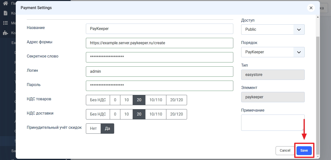 Укажите в этом поле ссылку для оповещений в зависимости от адреса вашего сайта. Например, если домен вашего сайта example.ru, то укажите https://example.ru/index.php?option=com_easystore&task=payment.onPaymentNotify&type=paykeeper