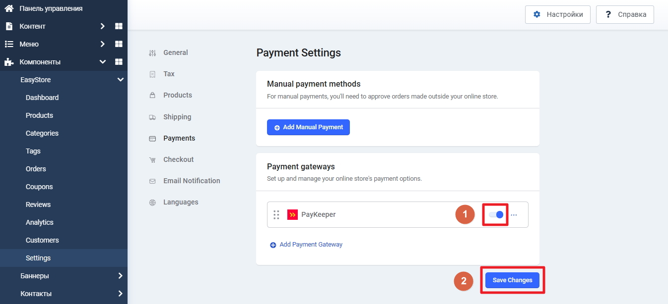 Далее напротив «PayKeeper» кликните по тумблеру включения способа оплаты и нажмите кнопку «Save Changes» для сохранения изменений (рисунок 2.5).