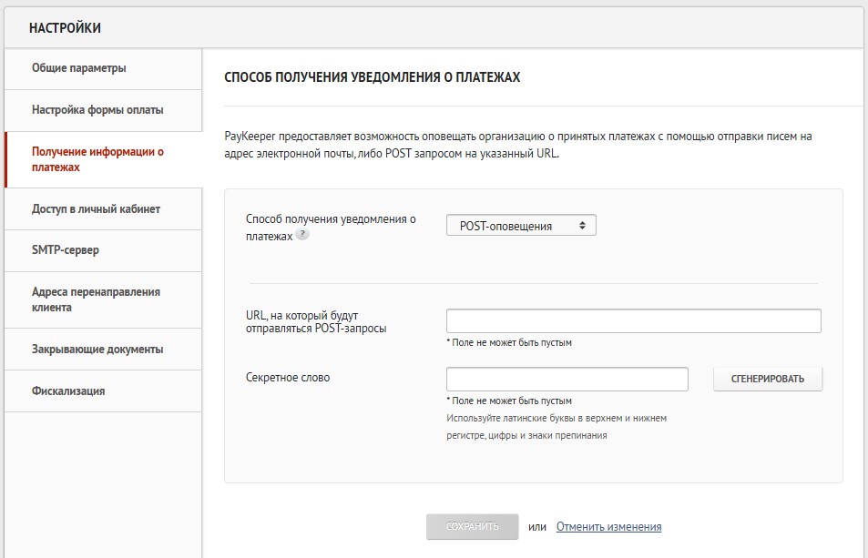 В вашем личном кабинете PayKeeper перейдите в раздел «Настройки». Нажмите вкладку «Получение информации о платежах». Заполните поля (рисунок 3.1).