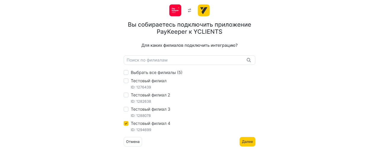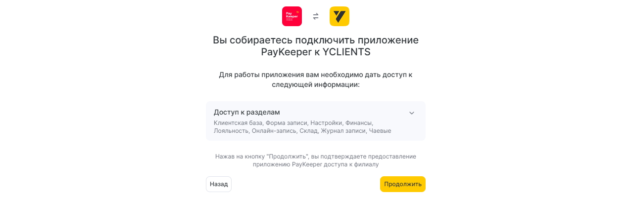 1.4. На следующем шаге подтвердите предоставление приложению PayKeeper доступ к выбранным филиалам нажатием кнопки «Продолжить».