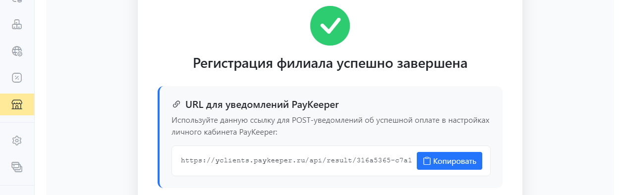 1.6. В случае успешной регистрации в ответ вы получите ссылку для POST-уведомлений об успешной оплате. Сохраните её, так как она понадобится для настройки личного кабинета PayKeeper в главе 3 настоящей инструкции.