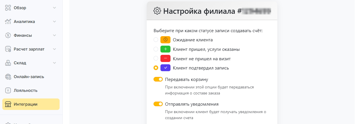 4.3. Если в настройках платёжного приложения PayKeeper будет включена опция «Отправлять уведомления», то ссылка на оплату этого счёта будет отправлена по Email и через SMS на контакты клиента записи при условии, что данная возможность активна в вашем аккаунте yClients.
