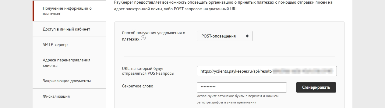 - URL, на который будут отправляться POST-запросы. Укажите ссылку, полученную после успешной регистрации филиала в главе 1 настоящей инструкции. Ссылка имеет вид https://yclients.paykeeper.ru/api/result/xxxxxxxx-xxxx-xxxx-xxxxxxxxxxxx, где вместо xxxxxxxx-xxxx-xxxx-xxxxxxxxxxxx у вас будет своё значение.