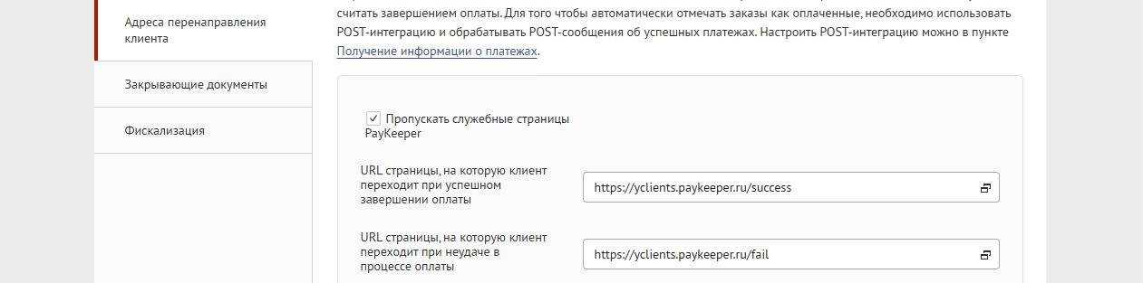 - URL страницы, на которую клиент переходит при неудаче в процессе оплаты. Укажите ссылку https://yclients.paykeeper.ru/fail, либо любую другую страницу по вашему желанию.