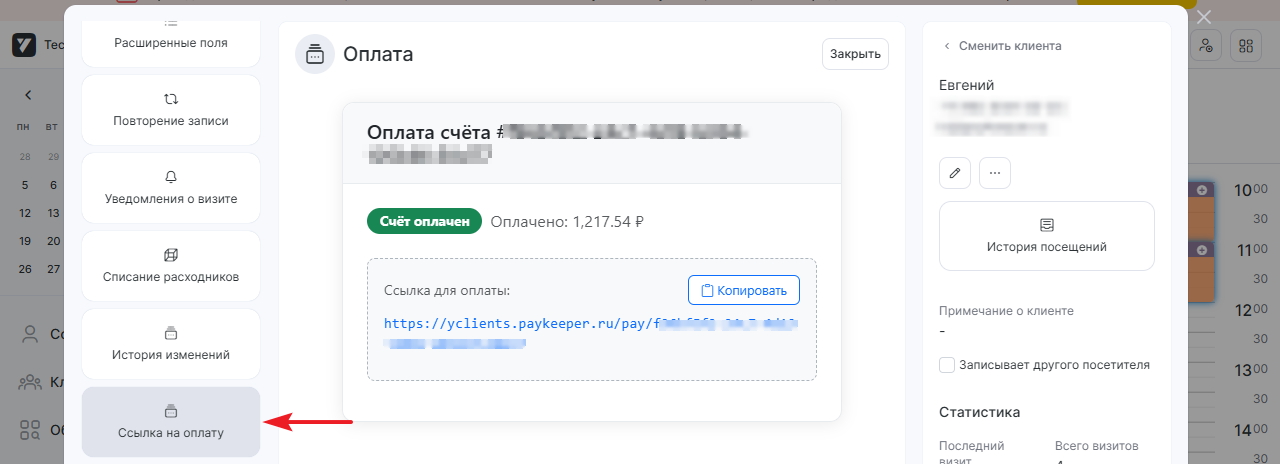 4.4. Ссылку на оплату также можно создать и скопировать в разделе о визите в окне записи.