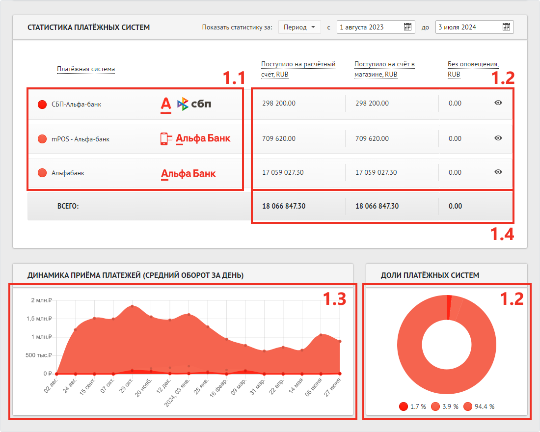 Обратите внимание, что если за указанный период по некоторым платёжным системам не было платежей, то в возвращённом ответе данных платёжных систем не будет.